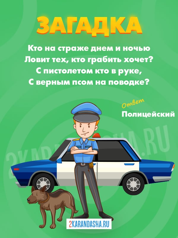 Мы предлагаем вам 26 загадок про полицейского для детей с ответами. Загадки про полицейского - хорошая информативная игра для малышей в детский сад (3-4 года и 5-6 лет) и школьников 7-8 лет (1-2 класс). В наших загадках про полицейского перечислены отличительные особенности этой профессии: ловля преступников, умение метко стрелять, особая форма.