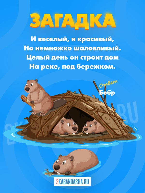 Мы собрали для вас 44 загадки про бобра для детей с ответами. Играть в наши загадки про бобра будет интересно малышам в 3-4 года, в 5-6 лет и даже уже школьникам 7-8 лет. Увлекательные загадки про бобра содержат много интересной информации о хвостатом строителе плотин. Все загадки про бобра рифмованные, это облегчает восприятие текста и поиск подходящего ответа.