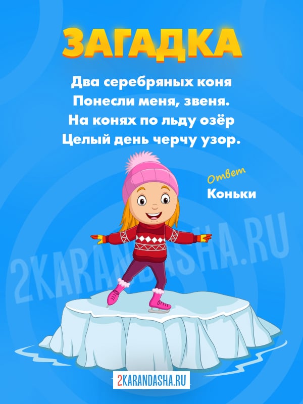 На этой странице вы найдете 45 загадок про коньки для детей с ответами. В загадках про коньки упоминается не только их назначение - кататься по льду, играть в хоккей, заниматься фигурным катанием, но и внешний вид - ботинки с лезвиями. Загадки про коньки отлично подходят для игр и занятий с малышами 3-4 года, дошкольниками 5-6 лет и первоклассниками.